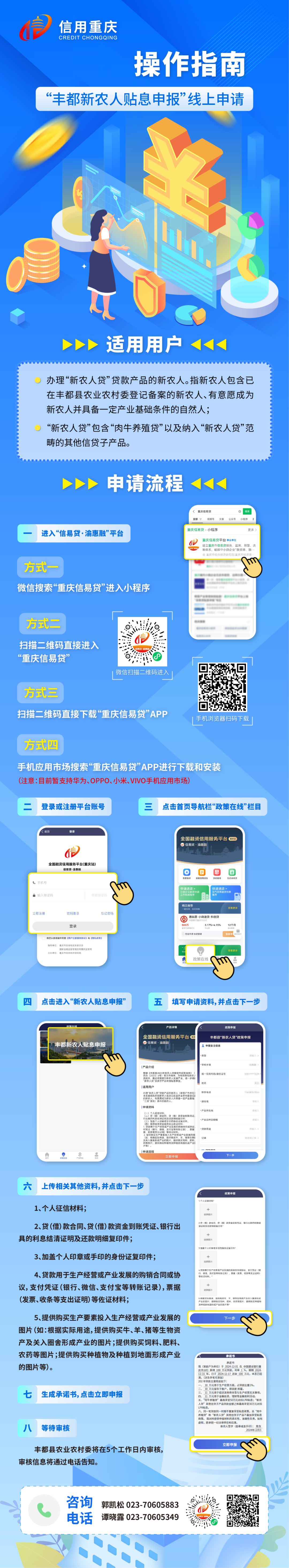 為貫徹落實國務院辦公廳《統籌融資信用服務平臺建設提升中小微企業融資便利水平實施方案》要求,推動各項金融便民惠企政策通過平臺直達中小微企業等經營主體,近期,全國融資信用服務平臺(重慶站)暨“信易貸·渝惠融”平臺上線豐都縣“新農人貸”財政貼息政策,面向符合條件的農業從業者,提供基準利率(LPR)財政貼息支持,切實降低融資成本,助力農業產業發展。